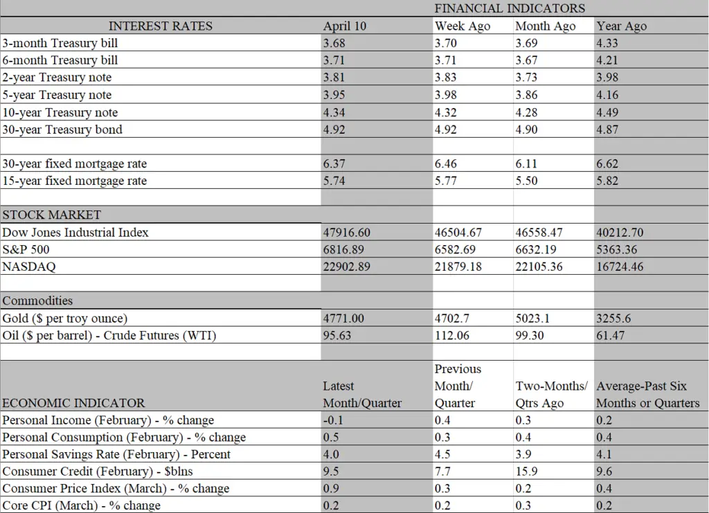 With a tenuous cease fire in effect hopes are running high that the unwinding of the oil surge will continue and return a sense of calm to the financial markets. So far, the price of crude is about one-third back towards its prewar level, and further progress will depend on negotiations planned over the weekend. Assuming positive headway is made, and oil continues to retreat, the old adage “gas prices go up like a rocket but falls like a feather” will be tested. As of Friday, prices at the pump have not budged from their peaks reached before crude started to descend, so drivers are still waiting for relief.