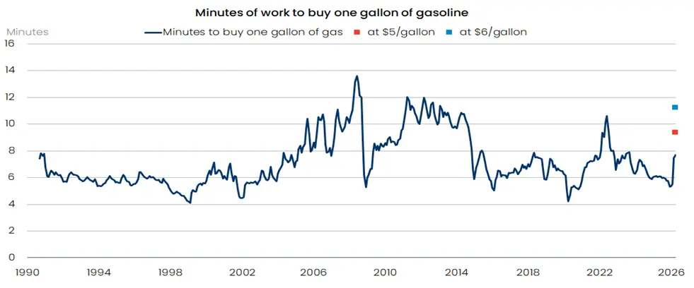 That means jobholders have to work longer just to fill up Old Betsy. At the latest nationwide average retail price of gasoline — $4.23 a gallon as of mid-April – nonmanagement employees are devoting 7.7 working minutes towards the cost of a service station visit, based on average earnings in March. That’s well above the time worked during the 1990s but exceeded several times over the past twenty years. However, should tensions flare up again and undercut the tenuous ceasefire, reigniting the oil price climb, things would get dicey. At $5 a gallon – which was widely considered approachable before Friday’s news – the gas-time spent on the job would rise to 9.34 minutes. At $6/gallon, more than 11 minutes would be needed, which exceeds the peak reached following Russia’s invasion of Ukraine in 2022. Importantly, a robust job market and strong worker bargaining power enabled the economy to weather that headwind. That’s not the case now.