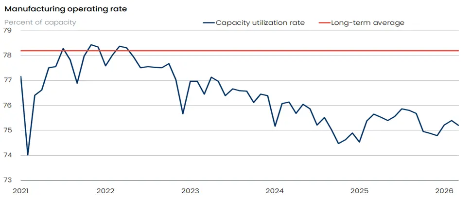 More important is the slack in manufacturing, which is more sensitive to cyclical forces and has historically aligned with the ebb and flow of inflation. A company running at full capacity has more pricing power than it would if its resources were underutilized. The slim 0.1 percent drop in manufacturing last month was not meaningful and weighed down by a slump in auto assemblies. But it left factories with an ample amount of unused capacity, so it would take a sizzling and sustained rebound in output before they are empowered to flex their pricing muscles. The manufacturing utilization rate stood at 75.2 percent in March, well below its long-term average (from 1972-2025) of 78.2 percent.