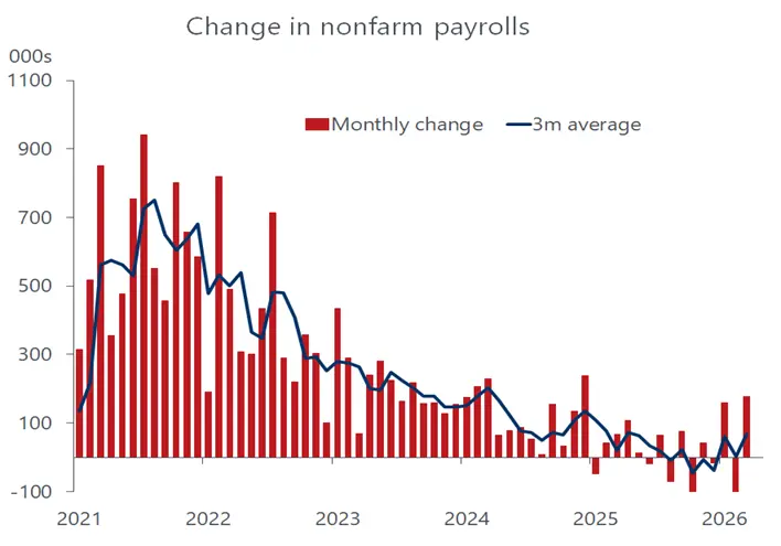 Much like the jump in payrolls, it would be a mistake to read too much into the drop in the unemployment rate in March, from an already low 4.4 percent to 4.3 percent. That drop was not for the “right” reason, with job seekers on the unemployment lines suddenly finding work. The employed headcount, taken from a separate household survey, fell for the third consecutive month. More important is that the labor force continued to shrink; indeed, except for the pandemic blip, the labor force in March fell from the year-earlier level for the first time since 2013, reflecting the immigration crackdown and an ageing population. Neither of those influences is expected to improve in coming years, so the economy’s dependence on AI-driven productivity gains for growth – still more of a promise than a reality – will only deepen.