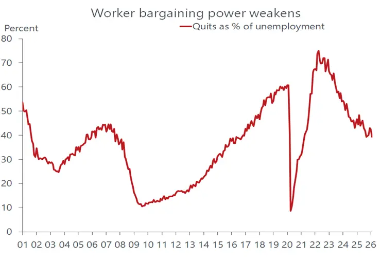 The good news for the macro economy is that the recent trend in earnings confirms that wages will not be a source of higher inflation. Nor should worker bargaining power strengthen anytime soon. The most visible evidence of that is the reluctance of workers to quit their jobs, believing that a better paying one could readily be found. The overall voluntary quit rate matches the lowest of the expansion. And except for the Covid plunge, the ratio of quits to unemployed workers is the lowest in more than 10 years. As much as anything, that highlights the profound shift in bargaining power from workers to employers that has taken place since the spring of 2025, when workers briefly flexed their bargaining muscle.