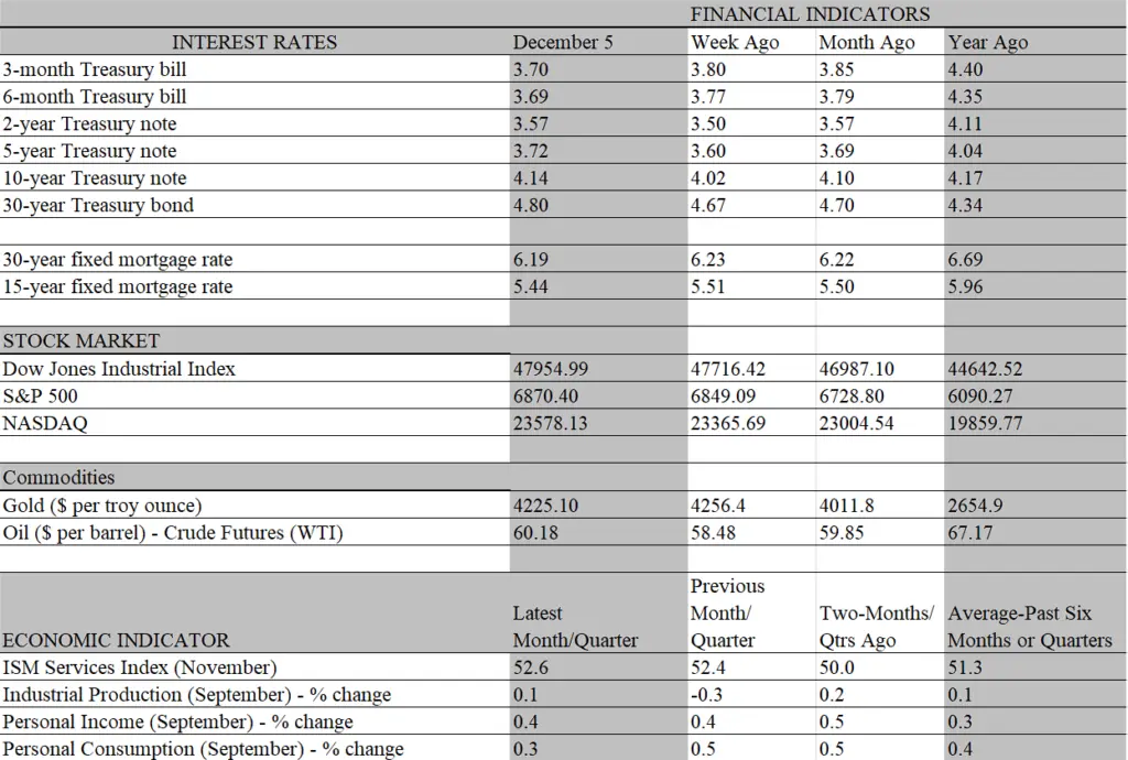 But it’s doubtful that the loss of momentum carried over into the fourth quarter. Most industry reports and anecdotal evidence suggest that the holiday shopping season got off to a robust start, with seasonal purchases shaping up to be the strongest since 2021. As we are about to see for the third quarter, a strong start to the period matters, as it imparts heft to the average reading for the quarter. Still, the purchasing strength is conflicting with the bad vibes from consumers, as household sentiment remains in the dumps. The University of Michigan’s sentiment index, released Friday, did edge up in early December, but that may be more of a bounce related to the end of the shutdown, brightening expectations a tad, than any sense of improving conditions