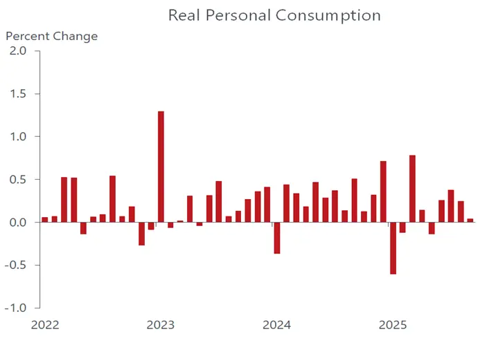 The weaker exit to the third quarter reflected a pullback by consumers, the economy’s main growth driver. That was documented last week with the soft retail sales data for September and confirmed this Friday with the more comprehensive data on personal income and consumption.  Total outlays on goods and services rose by 0.3 percent during the month, but the gain was all price-related, as real spending came in flat, following two months of solid increases which imparted a solid gain for the period. But in a clear sign of waning momentum, the September level of real spending stood only 2.1 percent higher than a year earlier, down from 2.6 percent in August and the weakest annual gain since January 2024.