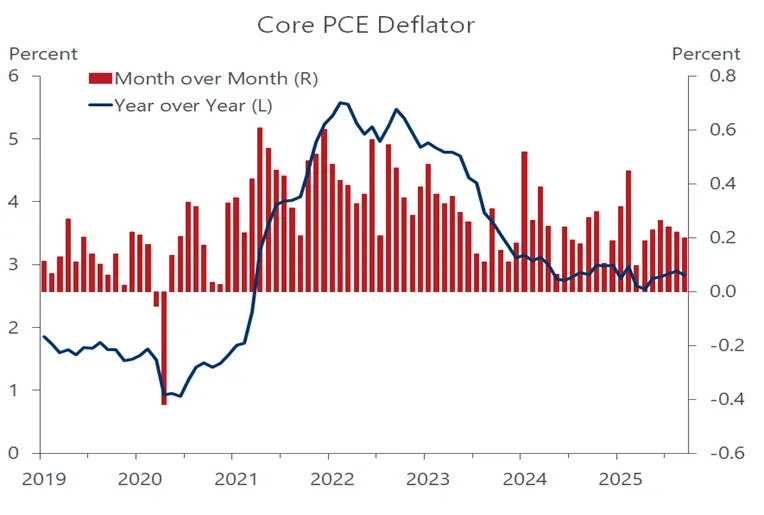 It may be that the increasingly popular “buy now, pay later” promotions are stoking the purchases of struggling lower-income households. If so, that augurs for some retrenchment in coming months when it’s time for them to pay the piper out of stretched budgets. We note that real disposable income is barely keeping up with real spending, rising by a slim 0.1 percent in September. Over the past three months, the average annual gain in real DPI slipped to 2.1 percent, the slowest since June 2023. That said, the struggles of lower-income households are more than offset in the spending space by older and wealthier consumers, whose appreciating home values and stock portfolios continue to support discretionary outlays. The bifurcated consumer continues to be more of a feature than a bug driving the U.S. economy.
