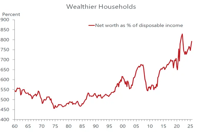 The wealthier people become, the more emboldened they are to save less out of income, as financial security is strengthened by their appreciated asset holdings. Historically, when net worth increases faster than disposable income, the savings rate has fallen. That pattern was on full display late last year, as consumers tapped deeply into savings to finance purchases. The personal savings rate in November fell to 3.5 percent, the lowest in more than three years. Just as the three-year stock market boom was getting its legs in March 2023, the savings rate stood at 6.0 percent. In the third quarter, households drew on savings to finance nearly 60 percent of the $321 billion increase in consumption, the largest share since the first quarter of 2022.