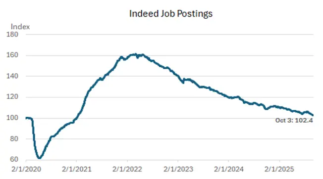 That said, as we noted last week, policy makers are not flying completely blind as the private sector does provide insights into evolving trends in the job market. One of those is the popular job site, Indeed, which provides data on job posting among other relevant information that tracks business demand for workers. The largest and most reliable source of information on this score is of course the Labor Department’s Jobs Opening and Labor Turnover Survey (the JOLTS report) which comes out monthly and, like the official jobs report, is unavailable because of the shutdown. But the data through August reveals that the job opening rate dropped significantly over the summer and at last count (at the end of August) equaled the lowest level since June 2020.