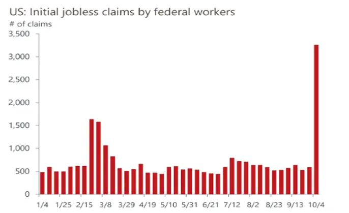 The one exception, unsurprisingly, is for the furloughed Federal workers, who are now eligible to file for unemployment and, as the chart shows, are beginning to do so in droves. It’s only the first week of the shutdown, and the spike in the latest week is the tip of the iceberg. Out-of- work Federal employees file for benefits under a separate government-run program. The main difference between them and unemployed workers in the private sector is that they must repay their benefits once their paychecks are restored at the end of the shutdown. However, with the president’s threat to keep some furloughed workers off the payroll permanently, odds are more of them will be collecting benefits for some time.