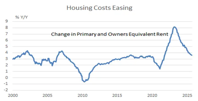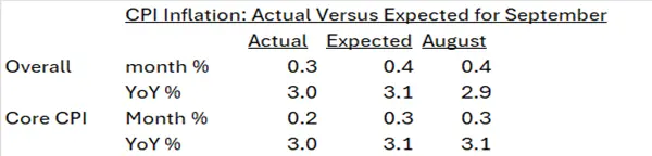 The path to the neutral level depends on how prices behave and how well the economy performs. With the shutdown still underway, there is little fresh information on the economy’s current performance. The CPI report at least raises the curtain somewhat on the inflation front. The good news is that the overall level of consumer prices rose by less than expected, something shown in the following table that includes expected outcomes based on Bloomberg surveys. As can be seen, both the monthly and yearly results fell a tad short of expectations with both the headline and core CPI, which excludes volatile food and energy prices, increasing by 3.0 percent over the past year.