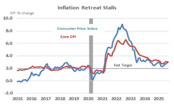 As the following chart shows, inflation has fallen sharply since the pandemic peak in the summer of 2022. But it has been moving in the wrong direction since this spring. The key reason for the mild uptrend is not difficult to find, tariffs. Admittedly, the levies imposed since the liberation day tariff blitz have not generated as much of an inflation boost as expected. By our calculations, about two-thirds of the tariffs have been passed on to consumers, contributing about 0.4 percent to inflation. Hence, absent the tariffs, inflation would be running about 2.5 percent, not 3 percent. We caution, however, that the pass through is poised to increase, as the ability of importers – the chain of suppliers from manufacturers to wholesalers to retailers – to absorb the higher costs of imported goods is weakening due to the squeeze on profit margins.